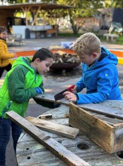 Favorit bei den Mädels waren die Drachenaugen, bestehend aus zwei überkreuzten Stöcken und bunten Wollfäden. Die Jungs erkundeten eher die Stadt, fuhren mit den Fahrzeugen umher, lösten Rätsel oder nutzen die Klanginstrumente und machten Musik. Viele nahmen Hammer und Nagel in die Hand und kreierten lustigen Nageltiere, die sie dann noch bunt anmalten. Handwerklich Begabte nagelten an den Bretterbuden aus Paletten herum und bauten diese weiter. Gerne wurden auch Steine mit Acrylfarben angemalt. Größtes Highlight waren die Plumpsklos, die von einigen ausprobiert wurden.