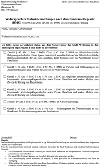 Zu Ziffer 2 bis 4 besteht nach § 50 BMG für alle Einwohner ein Widerspruchsrecht zur Übermittlung ihrer persönlichen Daten zum Zweck der Wahlwerbung, der Ehrung von Jubilaren und die Abgabe an Adressbuchverlage.