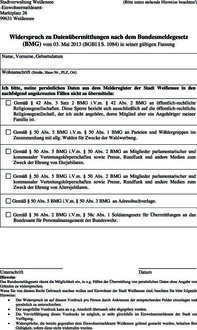 Zu Ziffer 2 bis 4 besteht nach § 50 BMG für alle Einwohner ein Widerspruchsrecht zur Übermittlung ihrer persönlichen Daten zum Zweck der Wahlwerbung, der Ehrung von Jubilaren und die Abgabe an Adressbuchverlage.