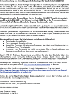 Die Anmeldung aller Schulanfänger für das Schuljahr 2026/2027 findet in diesem Jahr am 05. und 06. Mai 2025 in der Zeit von 14.00 bis 18:00 Uhr in der Traumzauberbaum- Grundschule Weißensee (Sekretariat Eingang Schäferstraße) statt.