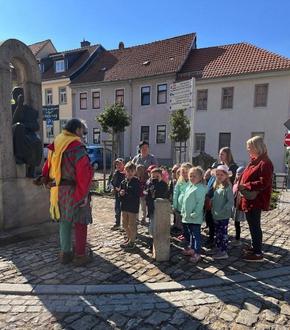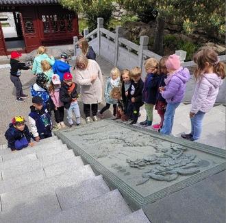 In den letzten Wochen haben wir mit Frau B. Hoffmann den Chinesischen Garten besucht. Wir saßen im Hochzeitspavillon, sind über die Zick-Zack-Brücke und haben die Krieger bestaunt. Desweiterem führte uns Herr H. Hoffman mit seiner Leier von der Postsäule am Denkmal von Walter von der Vogelweide vorbei zum Rathaus. Er sang uns ein Lied aus vergangenen Zeiten, welches für die Kinder sehr seltsam klang. Vor dem Rathaus ließen wir dann den „Taler wandern“.