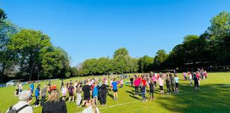 Nachdem das Sportfest am ersten geplanten Termin buchstäblich in Wasser fiel, konnte es eine Woche später bei strahlendem Sonnenschein am Montag, dem 13. Mai 2024 auf dem Sportplatz am Fischhof stattfinden.