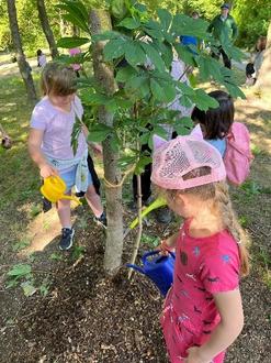 Die Klasse 1a und ihre Klassenlehrerin, Frau Fenderl, konnten eine Korkenzieherweide setzen. Vorher war jedoch Muskelkraft erforderlich, denn das Pflanzloch musste mit Hilfe von Spaten ausgehoben werden, was mit vereinten Kräften sehr gut gelang. Frau Blume und Frau Kühnel kamen mit ihrer Klasse 1b. Ihre Baumpflanzung stand unter dem Motto „Aus alt mach neu“. Von einer bereits bestehenden Kastanie musste die abgestorbene Krone abgesägt werden. Ein vorhandener junger Trieb wurde dann so gezogen, dass er zu einem stattlichen Baum heranwachsen kann. Natürlich haben beide Klassen ihre Bäume ordentlich angegossen, um ihnen damit beim Anwachsen eine gute Grundlage zu bieten. Vielleicht können während der Sommerferien die Eltern und die Kinder bei einem Spaziergang am Gondelteich mit einem kleinen Schluck Wasser die „Pflege“ der Bäumchen übernehmen.
