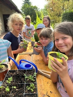 In der zweiten Woche begab man sich in die Natur, um sie mit Bestimmungsbüchern und Lupengläsern zu erforschen. Auf dem Campingplatz wurden mit Hilfe der Thepra Vogelfutterplätze erstellt und im Landschaftspflegeverein bepflanzten wir Kräutertöpfe. Die letzte Woche war geprägt von Technik. Mittels verschiedener Baukästen konnten die Kinder ihrer Kreativität freien Lauf lassen. Dabei entstanden die tollsten Sachen. Beim Ausflug ins Dreyse Haus nach Sömmerda lernten wir alte Schreib- und Maschinentechnik kennen.