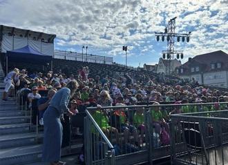 Nach dieser einstündigen Open-Air-Veranstaltung bei herrlichstem Sommerwetter kribbelte es dann doch in den kleinen Beinen unserer Schüler und Schülerinnen. Auch Durst und etwas Hunger machten sich breit. Nach einem letzten Anblick auf die beeindruckende historische Kulisse, natürlich auch auf das Bühnenbild und den Eifelturm mit der gigantischen Rutsche über den Domstufen, welche die Kinder so gerne ausprobiert hätten, verließen wir das Gelände. Bis zur Abfahrt schlenderten wir noch über den Domplatz, auf dem gerade Wochenmarkt war und bestaunten die historischen Häuserzeilen. Pünktlich zu Unterrichtsschluss fuhren die drei Busse der ÖPNV wieder an unserer Schule vor.