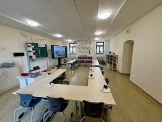 Auch die Raumbeleuchtung wurde erneuert. Das Klassenraum-Mobiliar umfasst eine Vielfalt an Möbeln wie höhenverstellbare Tische und ergonomische Stühle für flexibles Arbeiten, Schränke und Regale für Stauraum und Raumteilung sowie verschiedene Tafeltypen für unterschiedliche Lernmethoden. Durch die angepasste Raumgeometrie wurde eine optimale Lernumgebung geschaffen.