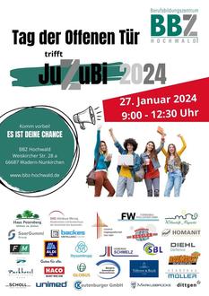 Von 09:00 - 12:30 Uhr lädt das BBZ Hochwald Jugendliche und deren Eltern ein, sich ein Bild von den Schulformen, den Schulabschlussmöglichkeiten, der Ausstattung und den Unterrichtskonzepten zu machen. Durch hochmoderne, voll ausgestattete Kompetenzzentren wie Industrie 4.0, Robotik und Sensorik oder Gesundheit und Pflege bietet das BBZ Hochwald optimale Lern- und Lehrvoraussetzungen, was die Anzahl an Landesbeste bestätigt. Alle Fachrichtungen – „Wirtschaft und Verwaltung“, „Gesundheit und Soziales“ sowie „Technik“ - werden am BBZ Hochwald in verschiedene Schulformen unterrichtet und der Lehrstoff in digital voll ausgestattetet Räumen vermittelt. Ob für die Schulform Ausbildungsvorbereitung, die Berufsfachschulen oder die Fachoberschule, alle Fachlehrer und Fachlehrerinnen stehen am Tag der offenen Tür für Fragen zu Lerninhalten und Schulalltag zur Verfügung. Verbunden wird der Tag der Offenen Tür mit der Ausbildungsmesse „JuZuBi“, die zum zweiten Mal stattfindet. Regionale Ausbildungsbetriebe stehen an diesem Tag zum direkten Austausch zur Verfügung.
