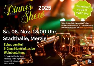 Im Herbst 2025 verwandelt sich die Stadthalle erneut zum Zentrum der Genuss- und Kulturwelt. Ein kulinarischer Streifzug durch die regionale Küche erwartet die Gourmets am 08. November in Merzig. Neben einem feinst abgestimmten 6-Gang Menü inklusive Weinbegleitung, Aperitif und Digestif präsentieren die Veranstalter diverse Bühnen-Highlights aus der Vielfalt der Kultur. Durch den Abend führt traditionell der Garant für gute Laune - Michael Friemel vom Saarländischen Rundfunk. Tickets für dieses Event sind ab 05.12.24 um 09:00 Uhr online zu erwerben. Ebenso natürlich zu den Öffnungszeiten im Villa Fuchs Ticketbüro in der Merziger Stadthalle und in allen Ticket Regional Vorverkaufsstellen. Informationen unter 06861/93670 und www.villafuchs.de. Eine Veranstaltung des Kreiskulturzentrums Villa Fuchs und der Kreisstadt Merzig in Kooperation mit der Regionalinitiative „Ebbes von Hei““.
