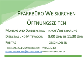 | Weiskirchen | 18:00 Uhr | Wortgottesdienst zum Weltgebetstag der Frauen |