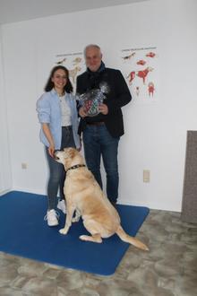 Hundephysiotherapeutin Kathrin Schneider mit Therapiehund „Carlo“ und Bürgermeister Stephan Barth