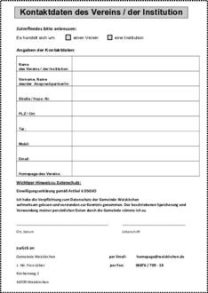 Sollten Sie daran interessiert sein, dass Ihr Verein oder Institution auf der Homepage der Gemeinde Weiskirchen veröffentlicht werden soll, möchten wir Sie bitten, den nachfolgenden Vordruck ausgefüllt an uns zurücksenden (per Email an: homepage@weiskirchen.de oder per Fax an 06876 / 709 - 18). Ebenfalls finden Sie den Vordruck auf unserer Homepage unter www.weiskirchen.de.