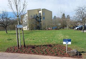 Die vom Ministerium bereitgestellten blaublühenden Vergissmeinnicht-Pflanzen wurden durch den Bauhof in ein Beet an der Hochwaldhalle im Ortsteil Weiskirchen eingepflanzt und ein entsprechendes Schild weist auf die Aktion hin.
