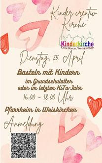 Basteln für Kinder im Grundschulalter und im letzten KiTa-Jahr. Von 16:00 -18:00 Uhr im Pfarrheim in Weiskirchen. Die gebastelten Werke können die Kinder mitnehmen. Anmeldung über den QR-Code, per E-Mail an kinderkirche-weiskirchen@t-online.de, oder Tel. 06876-325 (Mo-Fr 8:00 - 11:30 Uhr/ Mo 15:00-17:00 Uhr).