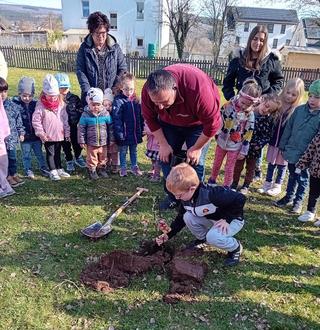 …dann wundert sich der ein oder andere sehr. Doch so war es tatsächlich in unserem katholischen Kinderhaus St. Jakobus in Weiskirchen. Hintergrund zu dieser tollen Überraschung war ein Gewinnspiel der Firma Eismann, an dem unsere Einrichtung vor einigen Wochen teilgenommen hatte. Und so konnte der Gewinn – ein Apfelbaum – kürzlich auf unserem Außengelände des Kinderhauses eingepflanzt werden. Die Kitakinder halfen dem Mitarbeiter der Firma Eismann tatkräftig bei der Pflanzaktion und erhielten im Anschluss an die getane Arbeit noch ein leckeres Eis. Wir freuen uns sehr darauf, unser neues Bäumchen zu pflegen und sind gespannt auf die erste Ernte.