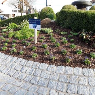 Die blaublühenden Vergissmeinnicht-Pflanzen wurden durch den Bauhof am Verkehrskreisel im Ortsteil Weiskirchen eingepflanzt und ein entsprechendes Schild weist alle Verkehrsteilnehmer aus Richtung der Straße „Auf der Heide“ als auch aus Richtung der „Trierer Straße“ kommend auf die Aktion hin.