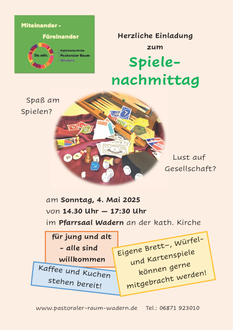 Am Sonntag, 04.05.2025 veranstaltet der Ausschuss Miteinander-Füreinander des Pastoralen Raums Wadern von 14:30 Uhr bis 17:30 Uhr im katholischen Pfarrheim in Wadern wieder einen Spielenachmittag. Wer Lust auf Gesellschaft bei Würfel-, Brett- oder Kartenspielen hat, ist herzlich eingeladen. Für Kaffee und Kuchen ist gesorgt; der Eintritt ist frei.
