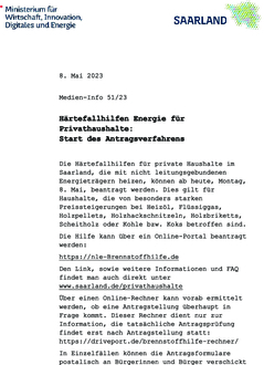 Die Härtefallhilfen für private Haushalte im Saarland, die mit nicht leitungsgebundenen Energieträgern heizen, können ab heute, Montag, 8. Mai, beantragt werden. Dies gilt für Haushalte, die von besonders starken Preissteigerungen bei Heizöl, Flüssiggas, Holzpellets, Holzhackschnitzeln, Holzbriketts, Scheitholz oder Kohle bzw. Koks betroffen sind.