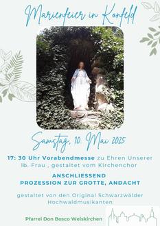| Konfeld | 19:00 Uhr | Maiandacht zu Ehren der Gottesmutter an der Grotte |