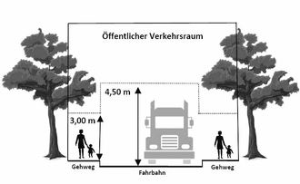 Sofern kein Gehweg vorhanden ist, müssen mindestens 0,70 m zum Fahrbahnrand freigehalten werden.
