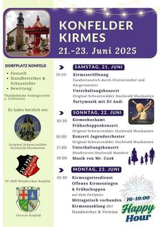 ich freue mich gemeinsam mit unseren Vereinen und den Schaustellern ein paar vergnügliche Stunden auf der Konfelder Kirmes mit Euch verbringen zu dürfen. Kommt vorbei und lasst uns feiern. Hoch lebe unser Schutzpatron Johannes der Täufer.