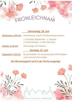 | Rappweiler | 17:30 Uhr | Festmesse zu Fronleichnam, mit Aussetzung des Allerheiligsten und euch. Segen mitgestaltet vom Kirchenchor der Fronleichnam - Teppich wird in der Kirche ausgelegt. Herzliche Einladung zur Feier dieses besonderen Gottesdienstes |