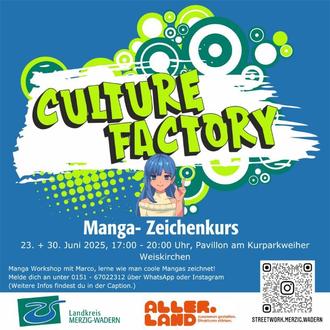 | Mo. 30.06 | 17.00 -20.00 Uhr | Manga- ZeichenkursVeranstaltung des Landkreises Merzig- WadernAnmeldung unter der Tel.- Nr. 0151- 67022312 | Pavillon am Kurparkweiher |