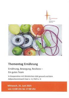 | Mi. 25.06. | 13.00-17.00 Uhr | Thementag Ernährung“Ernährung, Bewegung, Resilienz- Ein gutes Team“V. Hochwald-Kliniken Weiskirchen in Kooperation mit Weiskirchen lebt gesund und dem Adipositasnetzwerk Saar e.V./RLP e.V. | Hochwald-Kliniken Weiskirchen |