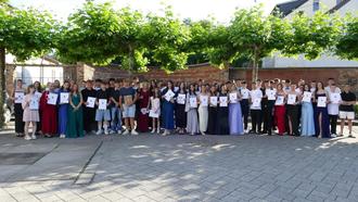 Am Mittwoch, dem 02.07.2025, konnten wir in einem sehr feierlichen Gottesdienst insgesamt 75 Schülerinnen und Schüler mit bestandenem Abschluss entlassen. 35 Schülerinnen und Schüler erhielten einen Hauptschulabschluss, 40 Schülerinnen und Schüler erhielten den mittleren Bildungsabschluss, davon 16 mit der Berechtigung zum Übergang in die gymnasiale Oberstufe. Dies ist eine tolle Leistung. Allen unseren Schülerinnen und Schülern meine herzlichsten Glückwünsche.