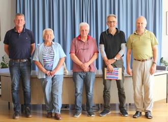Von links: Bürgermeister Wolfgang Hübschen, Brunhilde Sidhoum, Wolfgang Barth, Peter Groß, ausgeschiedene Mitglieder des Gemeinderates, Hauptamtsleiter Stefan Kania