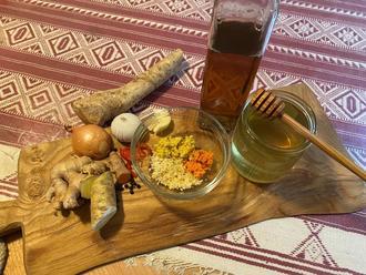 700 ml Apfelessig, mit 30 g geriebenen z. B. Knoblauch, 70 g gewürfelten Zwiebeln. 30 g frischen geriebenen Ingwer, 20 g frischen geriebenen Meerrettich, 15 g frische Peperoni/Chili, 30 g frische geriebene Kurkumawurzel, ¼ TL schwarzen Pfeffer, eine Bio-Zitrone und 2 EL Honig in ein Glas füllen. Nach zwei Wochen im Kühlschrank - mehrmals täglich das Glas schütteln. Danach kann der Sud in eine Flasche abgefüllt werden, die kühl bis ca. 3 Monate aufbewahrt werden kann. Schneller geht es im Mixer, wo die Zutaten püriert werden. Täglich einen EL mit 150 ml Wasser verdünnen und bis zu 5 x täglich die natürliche Antibiotika-Mischung vor oder nach den Mahlzeiten trinken - nüchtern ist die Wirkung stärker. Die Mischung eignet sich auch hervorragend für Soßen und Gerichte mit Essig, wie z. B. Salatsoße etc.