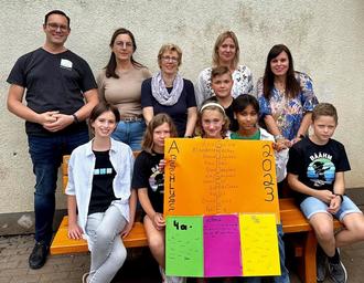 Obere Reihe v.l.n.r.: Thorsten Willems (Vorsitzender Förderverein), Stephanie Grasmück (Schulleitung), Simla Manas-Marx, Nina Lauer und Astrid Fox (Klassenlehrerinnen) Untere Reihe v.l.n.r.: Sarah Lehene, Lilly Weber, Summer Forster, Tom Köhl, Juliette, Leander Schuler (Klassensprecher und Stellvertreter)