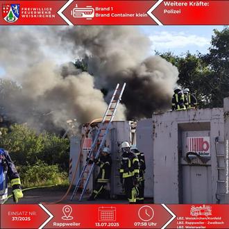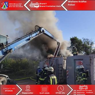 Im Gewerbegebiet Rappweiler brannte auf dem Gelände der Fa. Hero Ewald ein Container mit Elektroschrott. Die Löschbezirke Rappweiler, Weiskirchen-Konfeld und Weierweiler waren schnell zu Stelle und hatten den Brand schnell unter Kontrolle.