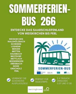 Von Weiskirchen bis Perl- ganz ohne Stress, Parkplatzsuche oder Stau. 5x täglich vom 5. Juli bis 17. August- ideal für Tagestrips mit Familie und Freunden.