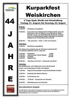 Die Gemeinde Weiskirchen lädt alle Bürgerinnen und Bürger, sowie Gäste aus nah und fern herzlich ein, ein Wochenende voller Musik, Bewegung und Genuss zu erleben. Der Eintritt ist frei- für das leibliche Wohl sorgen die teilnehmenden Wirte, ganz so, wie man es vom Kurparkfest der „guten alten Zeit“ kennt.