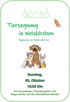 Wie jedes Jahr findet auch in diesem Jahr die Tiersegnung am Kurparksee im Staudengarten Weiskirchen (bei Regenwetter auf der überdachten Brücke) statt.