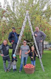 Ortsvorsteher Stefan Schuh mit seinen fleißigen Helfern bei der Apfelernte