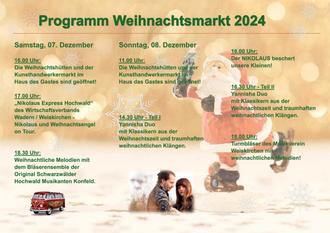 Neben vielen Leckereien, Geschenkideen und festlich geschmückten Ständen, dem Kunsthandwerkermarkt im Haus des Gastes, wird auch ein abwechslungsreiches Programm für die ganze Familie angeboten. Am Samstag wird der Weihnachtsbus für eine Überraschung sorgen. Neben traditioneller Weihnachtsmusik, dargeboten von dem Bläserensemble der Original Schwarzwälder Hochwald Musikanten Konfeld und den Turmbläsern des Musikvereins Weiskirchen sorgen, in Zusammenarbeit mit dem Kulturzentrum Villa Fuchs, Yannisha Duo für ein stimmungsvolles Ambiente bevor der Nikolaus den Weihnachtsmarkt besuchen wird. Die zweisprachig aufgewachsene Sängerin Anisha Adam widmet ihr Leben ihrer größten Leidenschaft - der Musik. Mit ihrer ausdrucksstarken Stimme sind sowohl entspannte Jazzsongs und groovige Soulsongs als auch starke Rocknummern kein Problem. Unterstützt wird sie von ihrem Ehemann Yann Loup Adam, Sänger, Songwriter und Gitarrist. Sein Herz schlägt vor allem für Chansons.