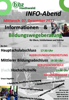 Am Mittwoch 07.12.2022 stellen wir Ihnen/dir am BBZ Hochwald in Nunkirchen die einzelnen Schulformen vor und stehen für alle Fragen zur Verfügung.