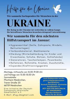 Montags, mittwochs von 16.00-19.00 Uhr und freitags von 15.00-18.00 Uhr. Sammelstelle: Pfarrheim Weiskirchen, Trierer Straße 20, 66709 Weiskirchen. Auch Geldspenden werden gerne entgegengenommen. Spendenkonto: Deutsch-französisch- ukrainische Gesellschaft e.V.