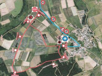 | Hierzu sind alle in die Teststrecke einmündende Wege und Straßen mit VZ 60 „Absperrschranke“ und die „Dorfstraße“ ab dem Anwesen Nr. 65 in Kombination mit VZ 250 „Verbot für Fahrzeuge aller Art“ nach dem beigefügten Verkehrszeichenplan zu sperren. |
