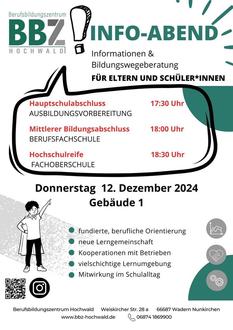 Im Januar 2025 können interessierte Jugendliche und ihre Erziehungsberechtigten am „Tag der offenen Tür 2025“ die Kompetenzzentren und Funktionsräume des BBZ Hochwald besichtigen und die verschiedenen Berufsbereiche in mehreren Live-Präsentationen erkunden. Weiterhin bieten wir im Februar 2025 gemeinsam mit der Eichenlaubschule Weiskirchen unsere Ausbildungsmesse „JuZuBi+ 2025“ an zu der über 20 Ausbildungsbetriebe der Region sich am BBZ Hochwald vorstellen. Die genauen Termine werden noch bekannt gegeben.