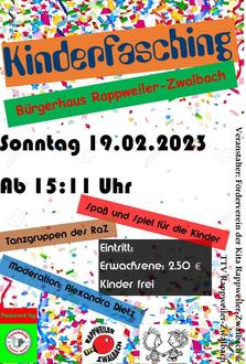 Herzliche Einladung an alle kleinen und großen Kinder zum närrischen Treiben am Faschingssonntag, 19.2.23 in das Bürgerhaus Rappweiler-Zwalbach! Um 15:11 Uhr startet der diesjährige Kinderfasching und hat mit Musik und Tanz, Spiel und Spaß, Essen und Trinken alles zu bieten. Mitzubringen sind gute Laune, Gemütlichkeit, Neugier und Applaus für die vielen helfenden Hände und tanzenden Füße, die diesen Nachmittag ermöglichen und verschönern. Dafür schon jetzt ein herzliches Dankeschön!