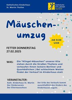 Im Anschluss besteht die Möglichkeit die noch nicht verkauften Fastnachtsmäuse im Kinderhaus zwischen 12:30 Uhr und 16:00 Uhr zu erwerben.