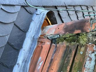 Auch an der Schiefereindeckung des Turmes sind Reparaturarbeiten notwendig. Die nur noch teilweise vorhandene Unterdeckung aus Bitumenbahnen ist brüchig und perforiert, Schiefern fehlen an mehreren Kanten und Abschlüssen, so dass Regenwasser eindringen kann. Der Fuß der Turmkrone mit Wetterfahne aus Kupferblech muss auch abgedichtet werden. Ein Teil des Gerüstes wurde bereits an die südwestliche Dachhälfte umgesetzt, um Zugang zu den vom Echten Hausschwamm betroffenen Schadstellen am Mauerwerk und im Dachbereich zu ermöglichen.