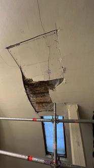 Die herausgeschnittene Deckenplatte wurde wieder eingesetzt. Unter dem abgefallenen Deckenputz kamen historische Bemalungen des Tonnengewölbes zum Vorschein.