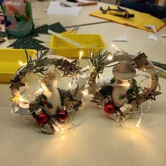 Frau Fischer, Frau Fattoumi und Frau Rommel luden vom ThEKiZ interessierte Eltern zu einer kleinen Auszeit beim Weihnachtsbasteln ein und es entstanden aus Holz kleine schöne Dekorationen für zu Hause.