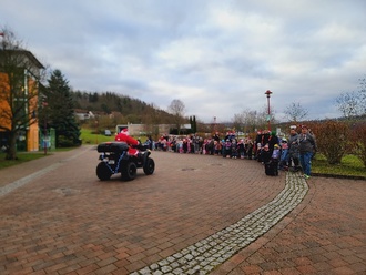 Der Weihnachtsmann kam auf seinem Quad zu Besuch, wir begrüßten ihn vor unserem Haus und sangen gemeinsam für ihn unsere Lieder. Das freute ihn sehr und aus seinem großen Sack kam für jedes Kind ein kleines Geschenkesäckchen zum Vorschein. Wir bedankten uns bei ihm ganz herzlich und wünschten auch dem Weihnachtsmann ein frohes Fest.