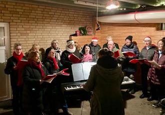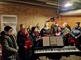 In diesem Jahr waren es zwei Auftritte. Der erste fand am Mittwoch, den 03.12.25, im liebevoll festlich geschmückten Hof der Familie Körner statt. Familie Körner hatte im Rahmen des „Lebendigen Adventskalenders“ Türchen Nummer 3 geöffnet und zum „Stimmungsvollen Adventsabend“ mit Liedern, Märchen und Geschichten, Tee, Glühwein, Plätzchen und Bratwürsten eingeladen. Der Chor sang insgesamt acht Lieder und gab am Ende sogar noch eine Zugabe. Mit dabei waren die Klassiker wie „Guten Abend, schön Abend“ oder „Sind die Lichter angezündet“ und auch englische Titel wie „Jingle Bells“ und „Rudolph, the red-nosed reindeer“. Während das Publikum am Anfang nur zuhörte, stimmte es gegen Ende kräftig mit ein und spätestens beim Nikolauslied sangen auch die Kleinsten lautstark mit.