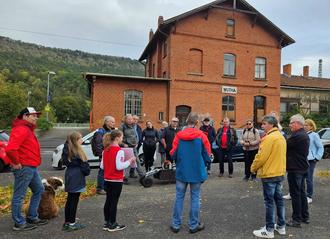 Auf die Spuren der Rühler Bimmel begaben sich am 07.10.2023 zahlreiche Interessierte aus dem Gemeindegebiet. In der ca. 2,5 stündigen Wanderung entlang der ehemaligen Bahntrasse konnten die Teilnehmer in die Historie der am 10. Juli 1880 in Betrieb genommenen Eisenbahntrasse von Wutha nach Ruhla eintauchen.