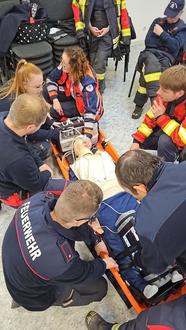 Hier wurde mit der Drehleiter der Stadt Ruhla die Patientenrettung mit laufender Reanimation geübt. Das Zusammenspiel der Einsatzkräfte zwischen Feuerwehr und Rettungsdienst stand hier im Mittelpunkt.